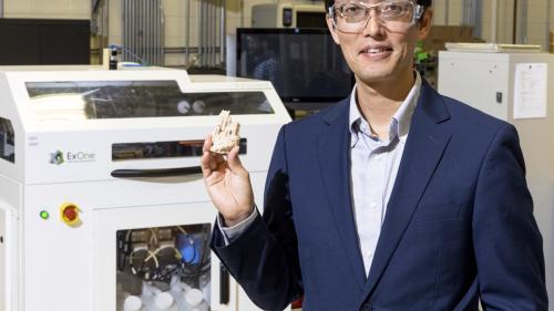 Researchers at the Department of Energy’s Oak Ridge National Laboratory designed a novel polymer to bind and strengthen silica sand for binder jet additive manufacturing, a 3D-printing method used by industries for prototyping and part production.